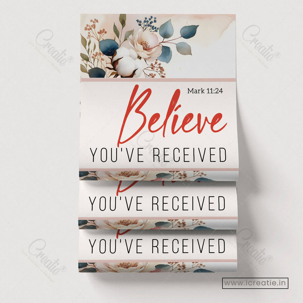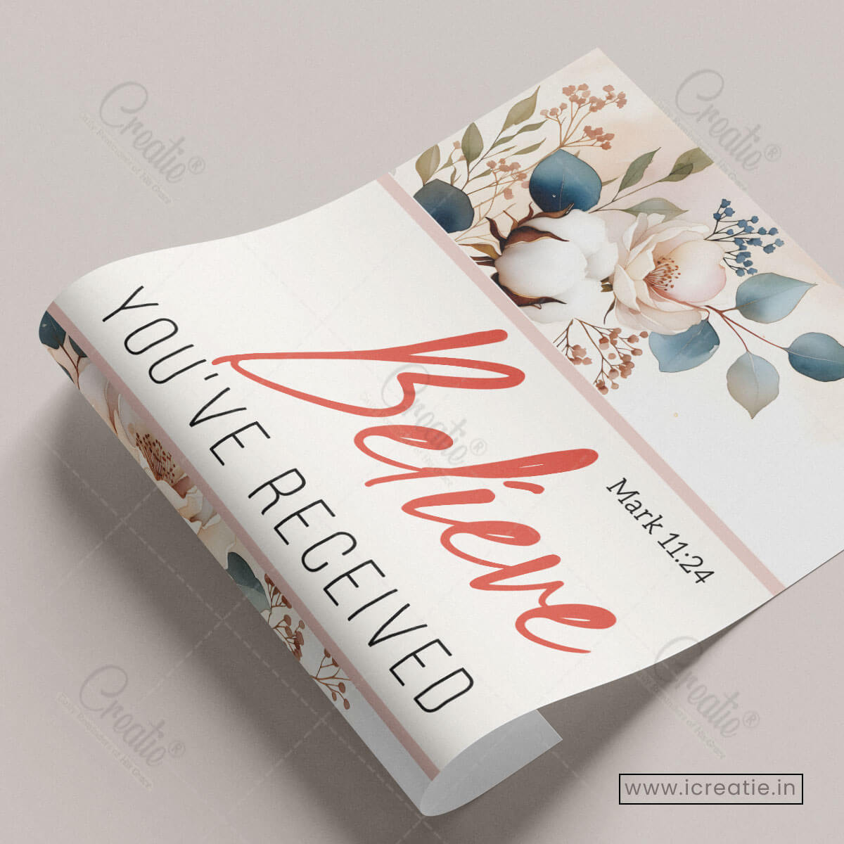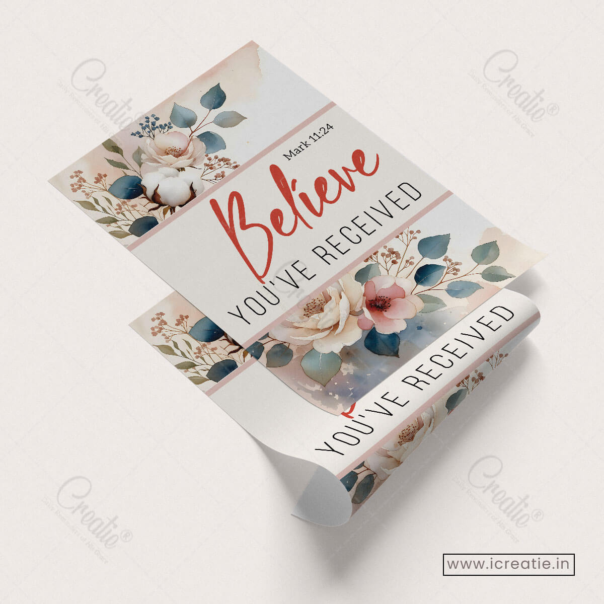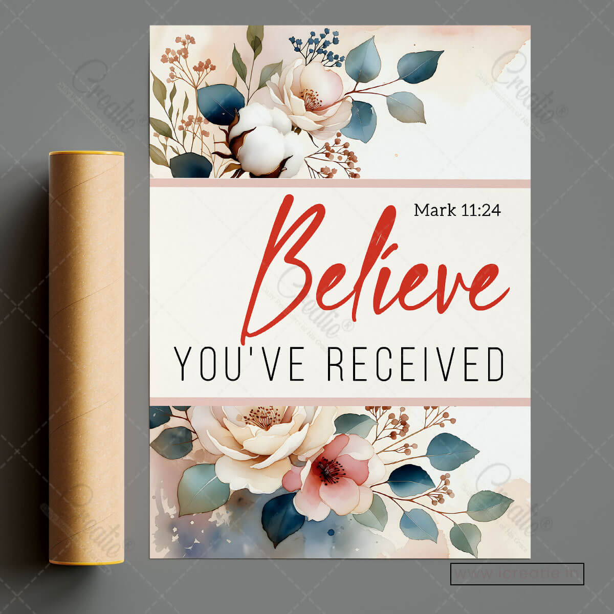 Mark 11:24 invites believers into a posture of deep trust — to pray with faith, believing that God hears and responds. This poster reflects that invitation through a clean, elegant design where gentle florals frame a bold declaration of belief and hope.
