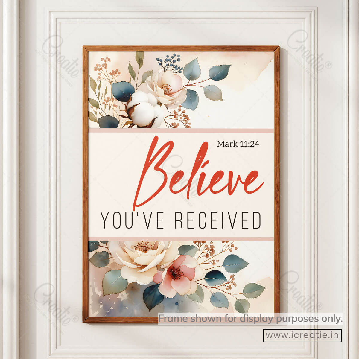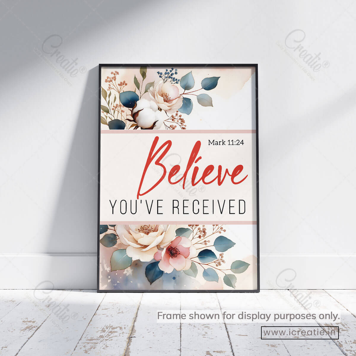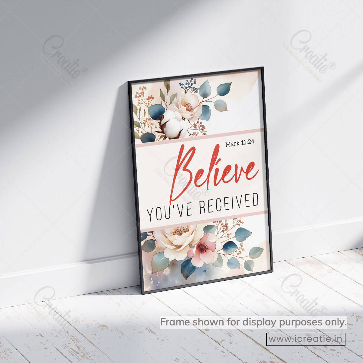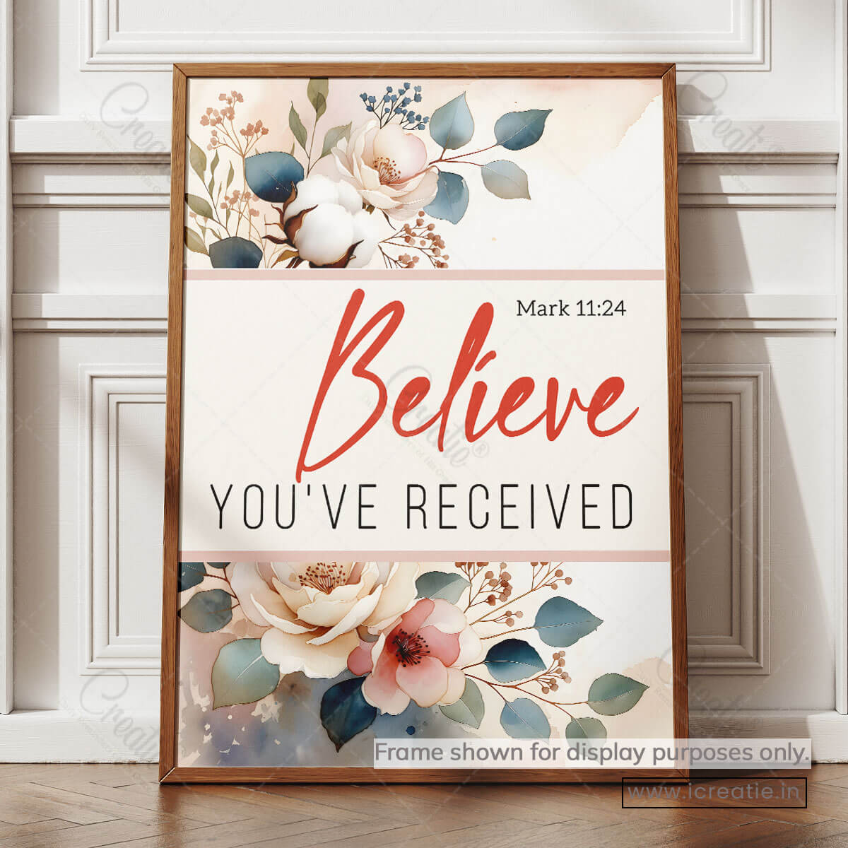 Mark 11:24 invites believers into a posture of deep trust — to pray with faith, believing that God hears and responds. This poster reflects that invitation through a clean, elegant design where gentle florals frame a bold declaration of belief and hope.