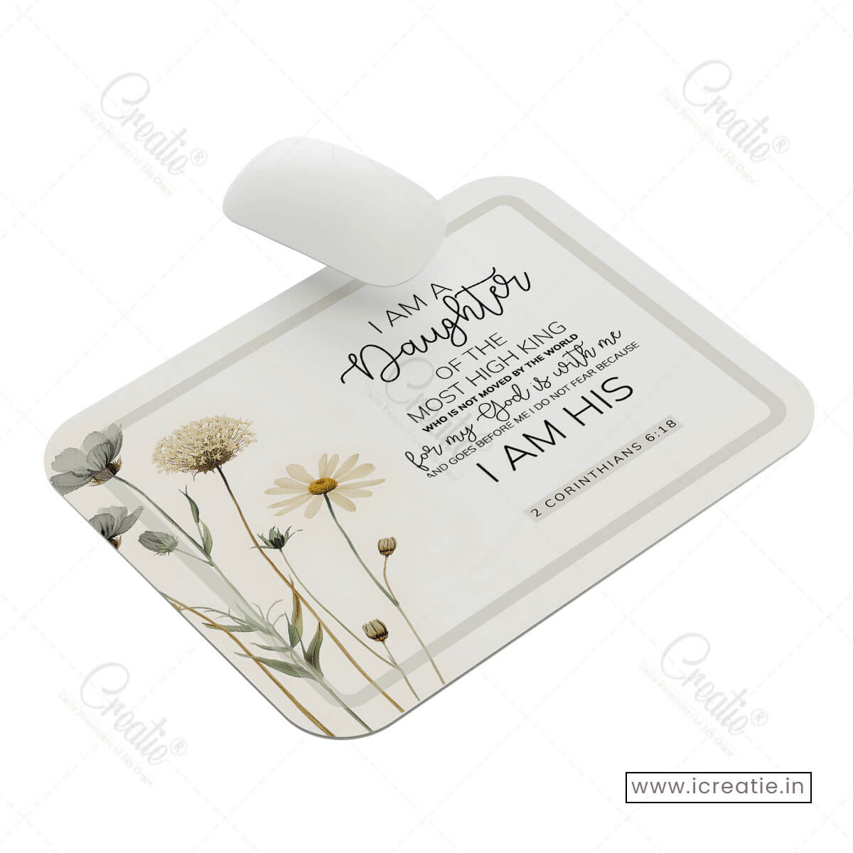 This mouse pad reflects that truth through a minimal, floral design paired with a powerful affirmation of faith. The soft tones and gentle layout create space for calm reflection, reminding you that you are a daughter of the Most High King — secure, known, and deeply loved.