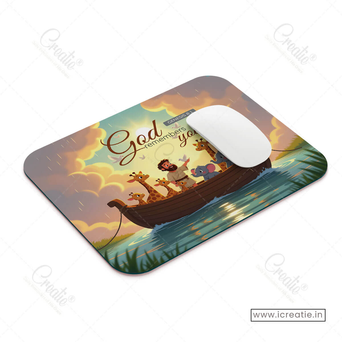 This mouse pad brings that truth to life through a heartwarming illustration of Noah surrounded by the animals, light breaking through the clouds, and calm waters below. It reflects a moment of reassurance — that God’s timing is faithful, His promises are sure, and His presence is constant.