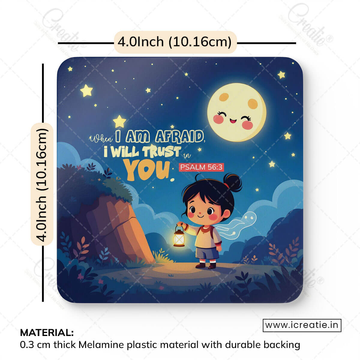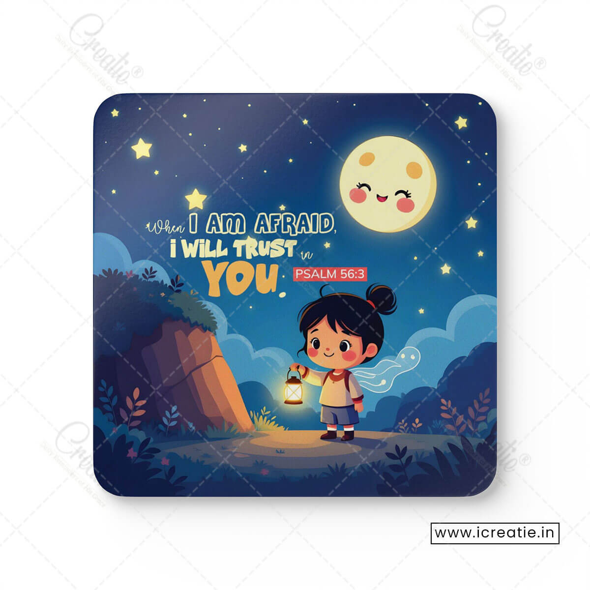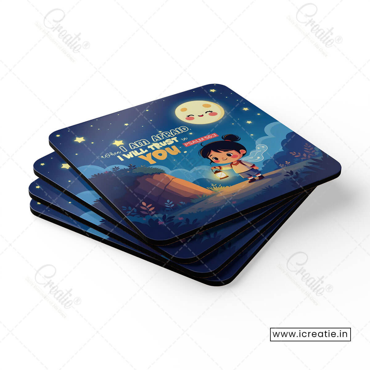 This coaster set brings that promise to life through a soft, night-time scene filled with gentle light and calm reassurance. The glowing lantern reminds us that even when fear appears, trust in God becomes our light and guide.